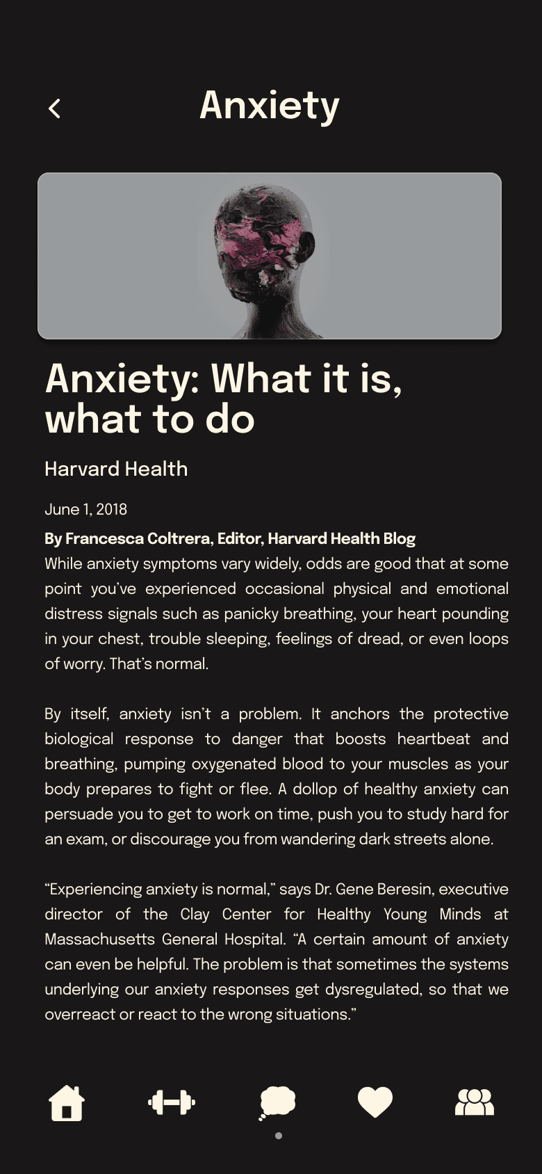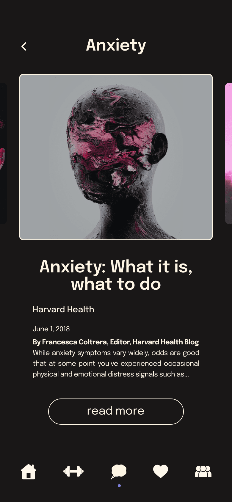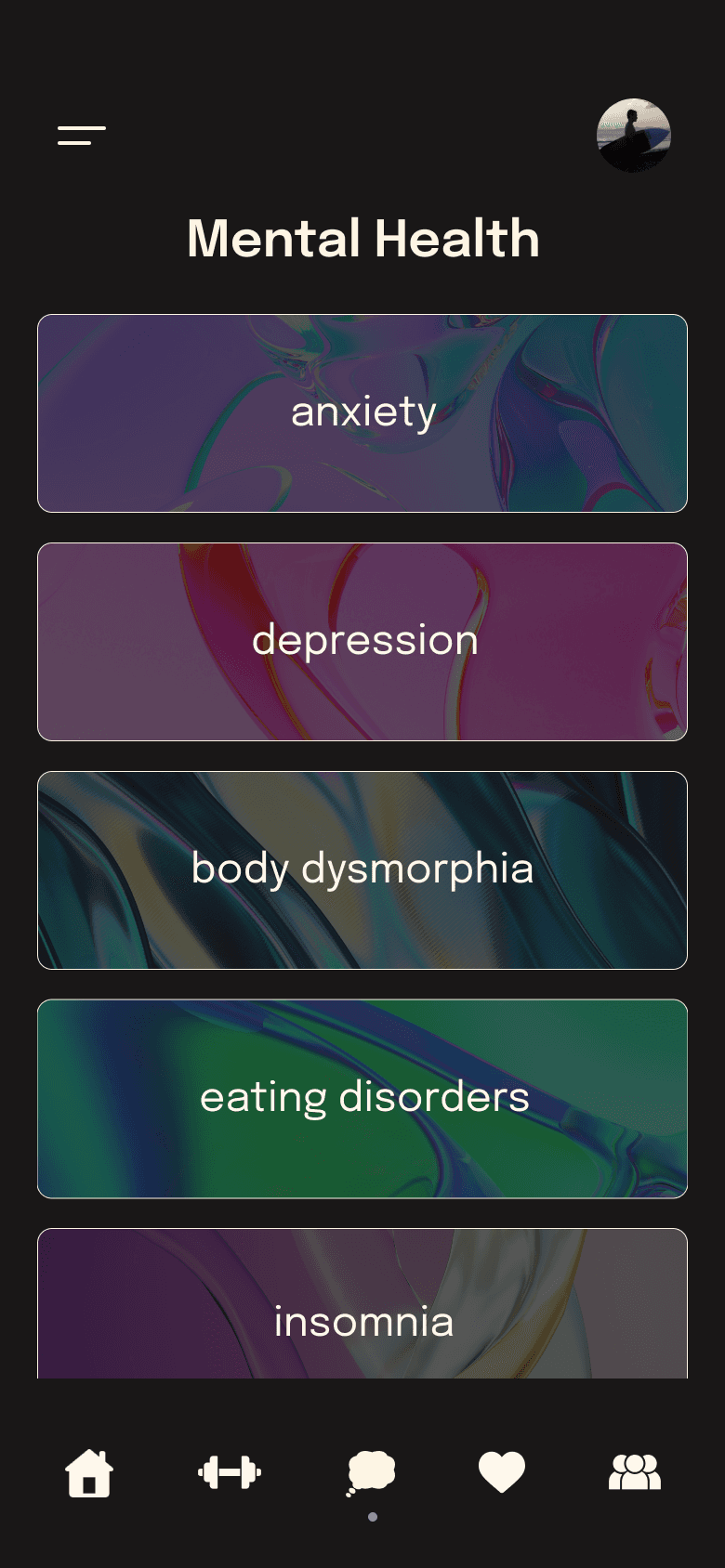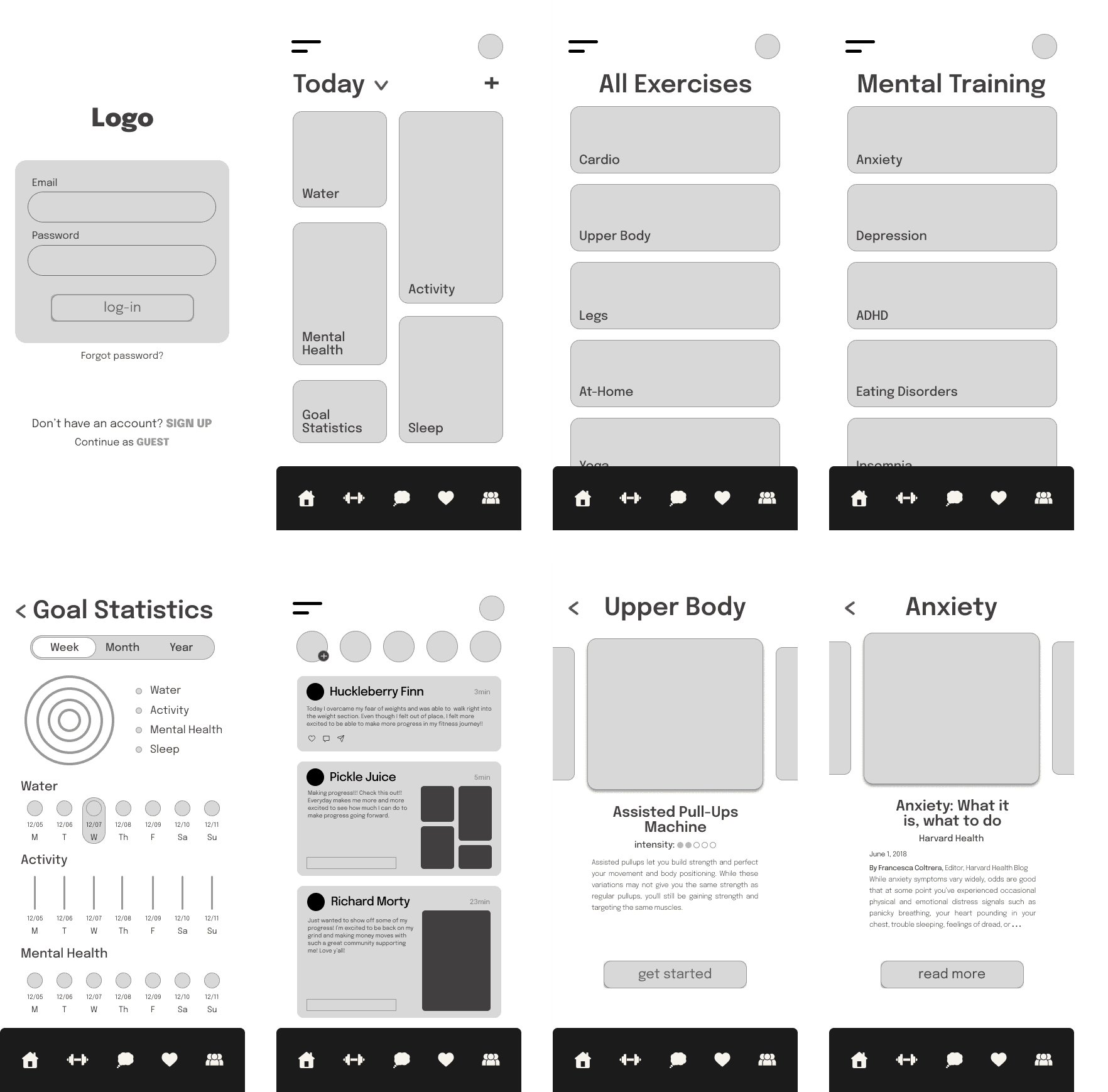 I included mental health pages because mental well-being is as important as physical health. While this section may see less frequent use, it offers resources addressing issues that can affect users’ ability to prioritize fitness. To maintain a cohesive design, these screens mirror the style and layout of the exercise pages.