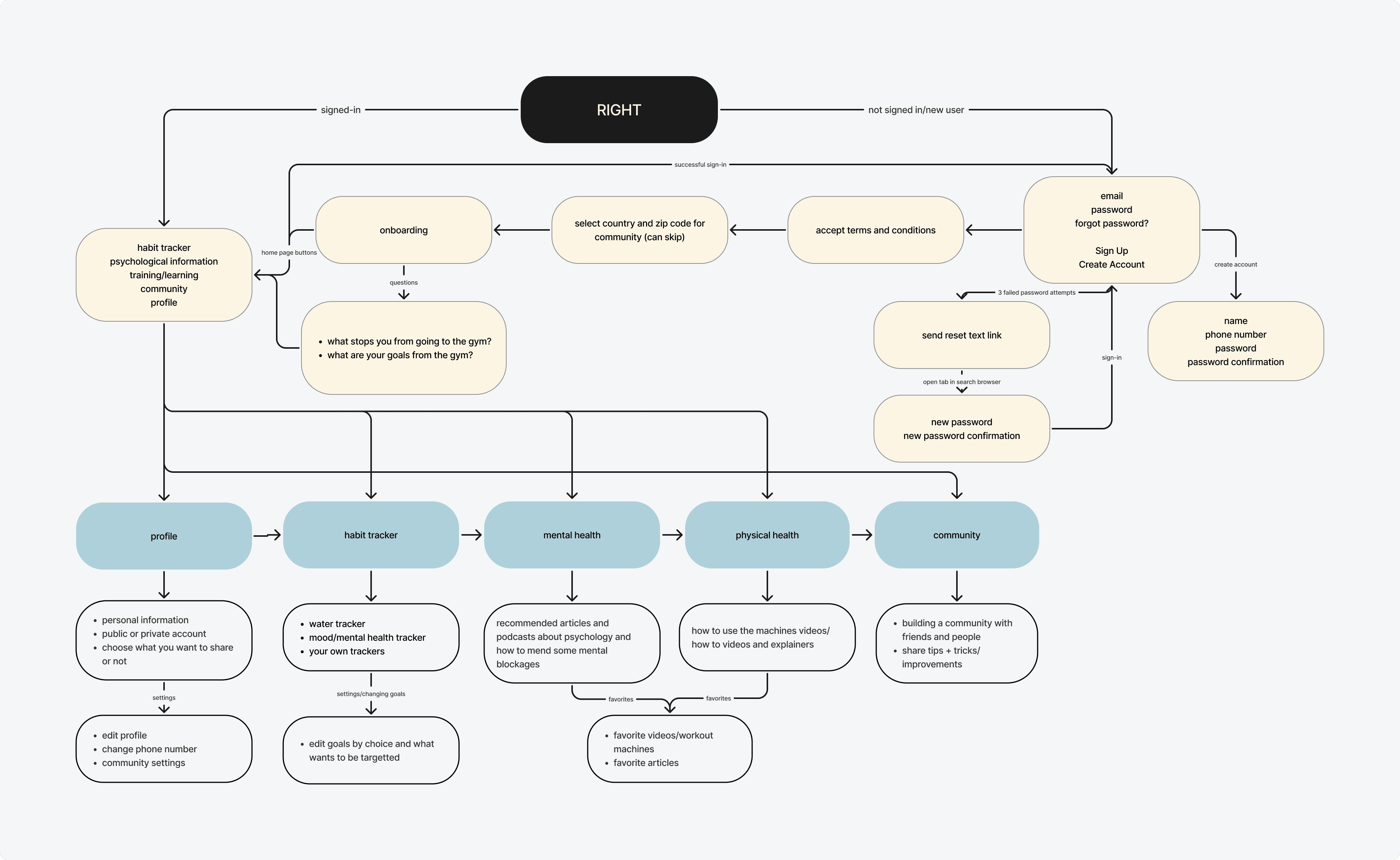 The information architecture helped prioritize the habit tracker and tutorial sections. At the core of the sitemap, I integrated key elements into the main navigation: habit tracking, mental health resources, physical training resources, and community features.